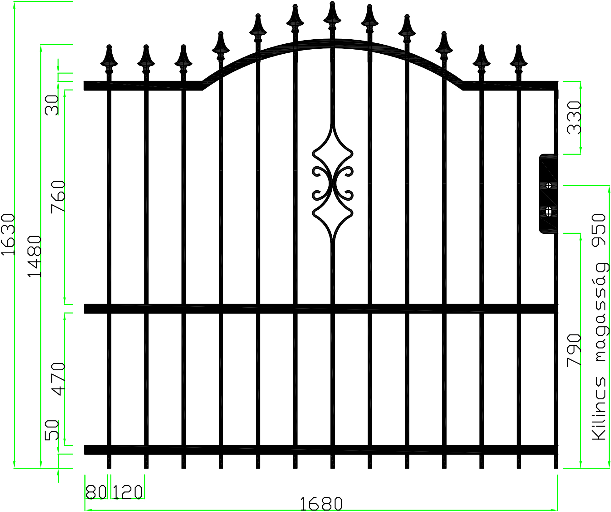 Strapabíró kerítéseket kínálunk: 12x12 mm-es tömör pálcákkal dolgozunk, melyeket 5x30 mm-es laposvasak közé helyezünk; a csúcsdíszeket hegesztjük.