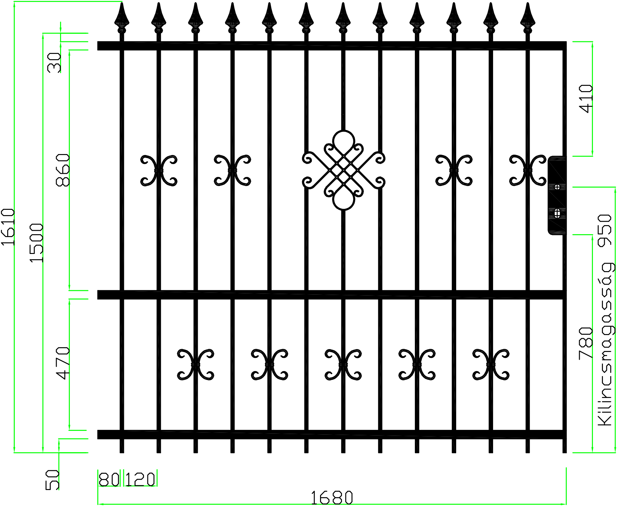 Strapabíró kerítéseket kínálunk: 12x12 mm-es tömör pálcákkal dolgozunk, melyeket 5x30 mm-es laposvasak közé helyezünk; a csúcsdíszeket hegesztjük.