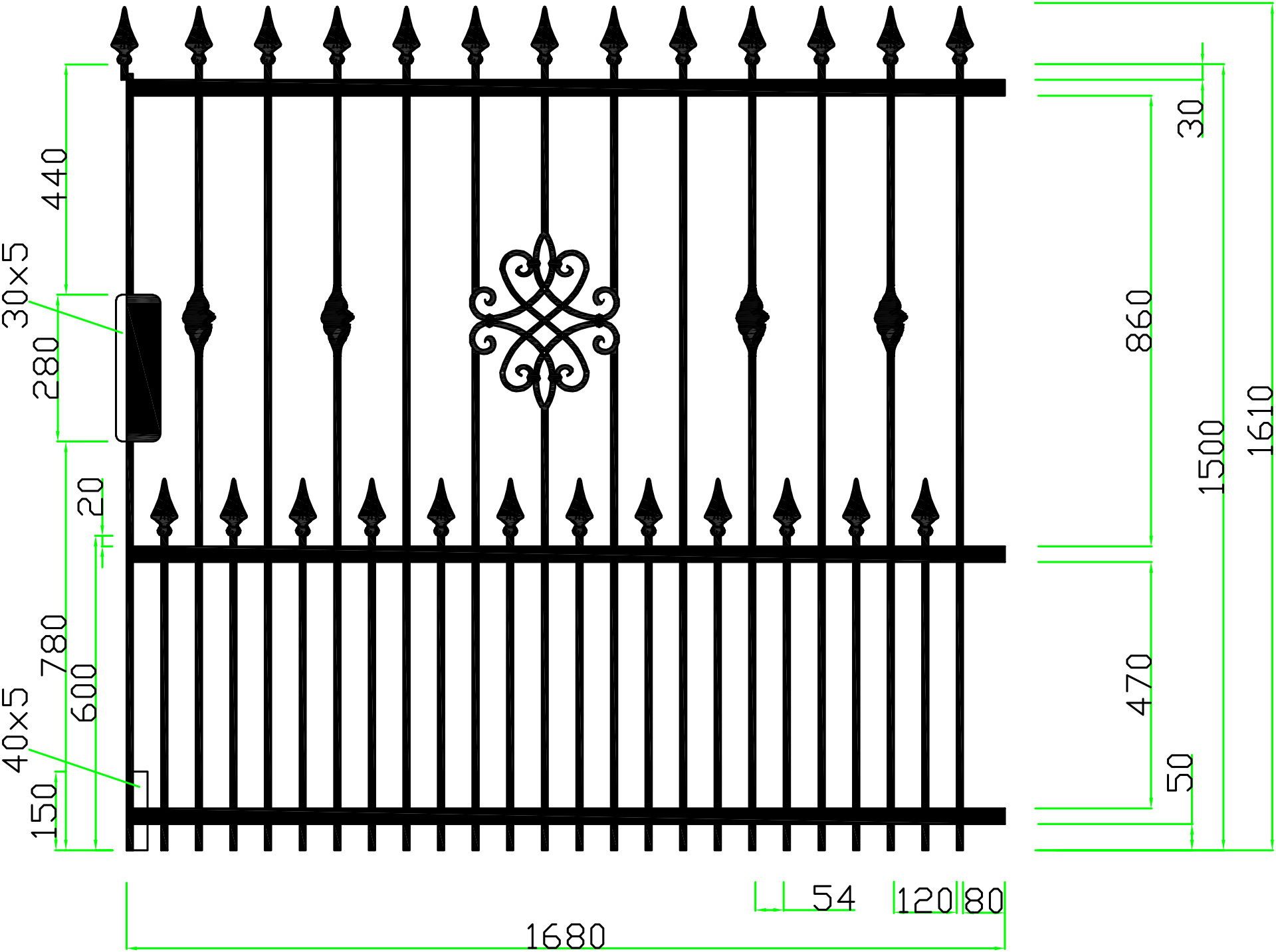 Strapabíró kerítéseket kínálunk: 12x12 mm-es tömör pálcákkal dolgozunk, melyeket 5x30 mm-es laposvasak közé helyezünk; a csúcsdíszeket hegesztjük.