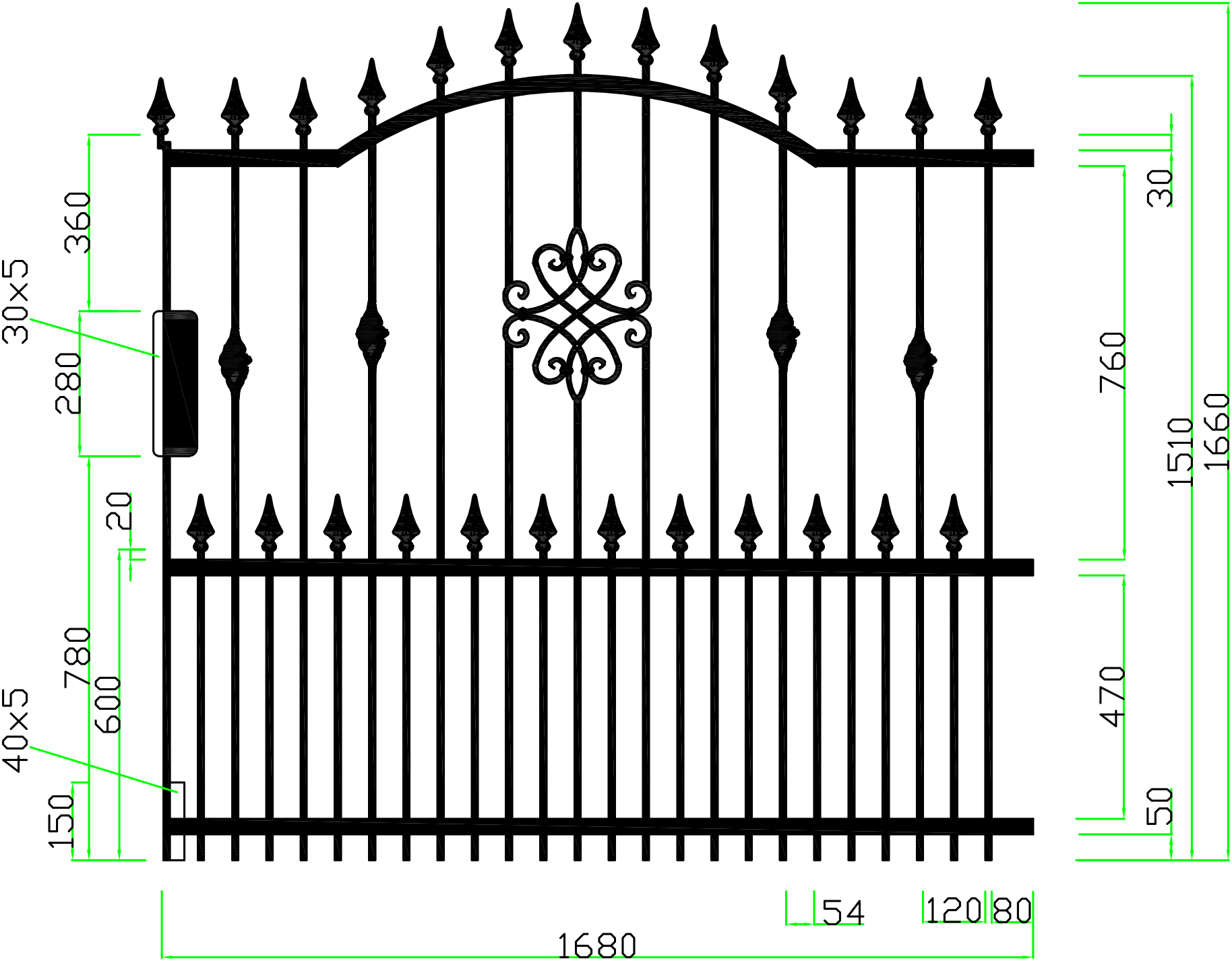 Visszafogott, könnyed díszítettséget ad a hagymákkal kísért rozetta, ezzel szemben az alsó részen sorakozó osztópálcák zártságot kölcsönöznek. Méretre alakítható megoldás, akár meglévő lábazathoz is szerelhető Kerítés elemeink univerzálisak, azaz fém-, illetve betonoszlophoz is könnyen illeszthető megoldást jelentenek. Egyenes és íves kivitelben Dalma motívum Kovácsolt jellegű fém méretre alakítható kerítéselem. Időtálló, biztonságos, 12*12 mm –es tömör anyagból készült