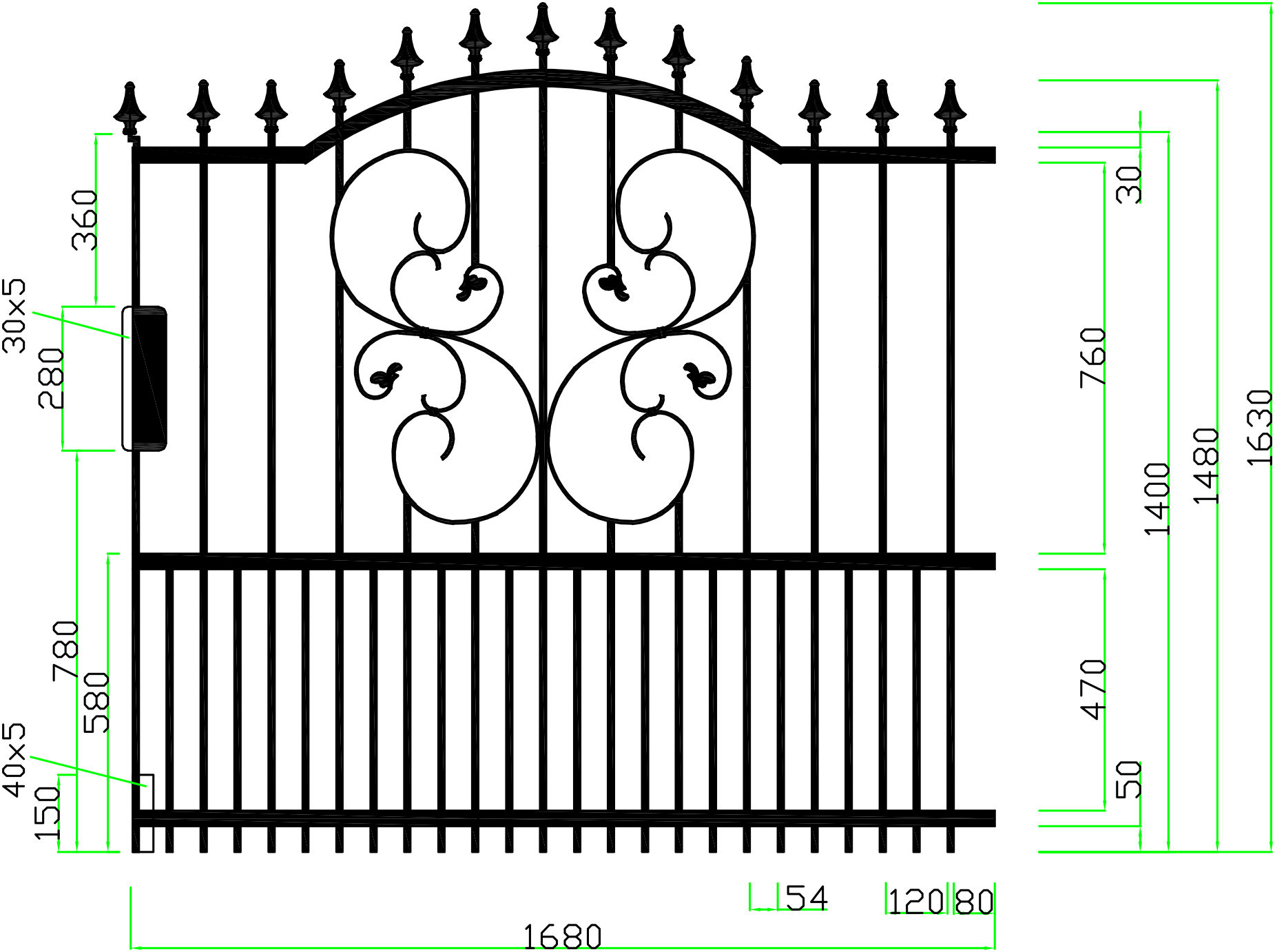 Strapabíró kerítéseket kínálunk: 12x12 mm-es tömör pálcákkal dolgozunk, melyeket 5x30 mm-es laposvasak közé helyezünk; a csúcsdíszeket hegesztjük.